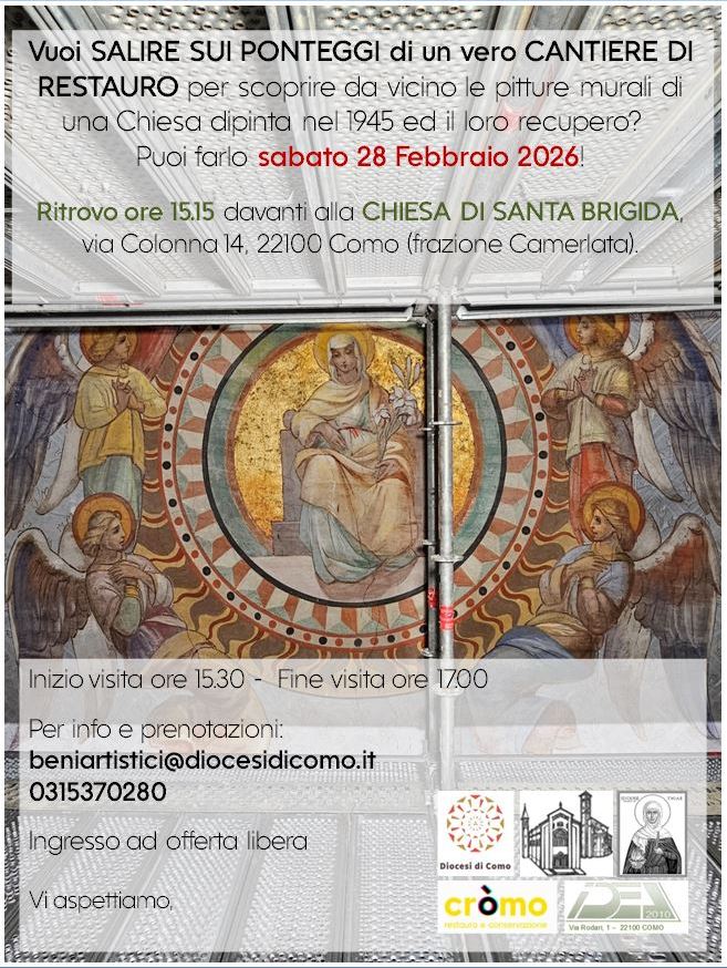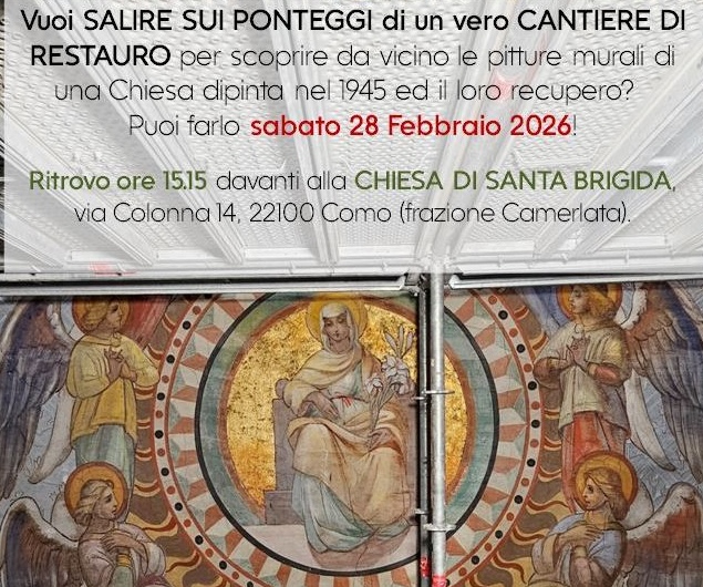 Sabato 28 febbraio 2026 sarà possibile salire sui ponteggi di un vero cantiere di restauro e osservare da vicino alcune delle pitture murali della Chiesa di Santa Brigida a Camerlata, entrando nel cuore del lavoro di tutela del patrimonio artistico.
